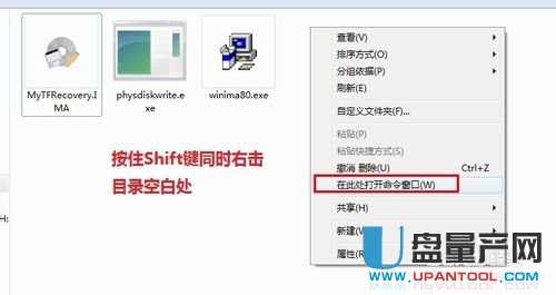 接下来利用读卡器将内存卡连接到电脑上,打开“MSDOS”界面,进入解压目录。特别的对于Win7用户,只需要在解压目录按住键盘Shift键同时右击目录,从弹出的菜单中选择“在此处打开命令行窗口”。