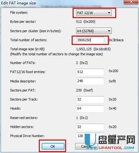 接着在打开的“Edit Fat image size”窗口中,选择“File System”为“Fat12/16”,将“Total Number Of Sectors”(扇区总数)设置为特定大小,小编的内存卡为2G,故应该设置为“2000000000/512=3906250”。然后点击“OK”按 钮将其保存到与下载解压目录相同的位置。